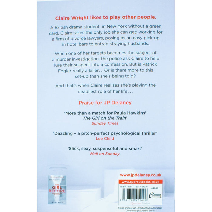 The Girl Before:Jane stumbles on the rental opportunity of a lifetime: the chance to live in a beautiful ultra-minimalist house designed by an enigmatic architect, on condition she abides by a long list of exacting rules. After moving in, she discovers that a previous tenant, Emma, met a mysterious death there - and starts to wonder if her own story will be a re-run of the girl before.A British drama student, in New York without a green card, Claire takes the only job she can get: working for a firm of divorce lawyers, posing as an easy pick-up in hotel bars to entrap straying husbands.When one of her targets becomes the subject of a murder investigation, the police ask Claire to use her acting skills to help lure their suspect into a confession. But right from the start, she has doubts about the part she's being asked to play.The Perfect Wife: Abbie wakes in a hospital bed with no memory of how she got there. The man by her side explains that he's her husband. He's a titan of the tech world, the founder of one of Silicon Valley's most innovative startups. He tells Abbie she's a gifted artist, a doting mother to their young son, and the perfect wife.